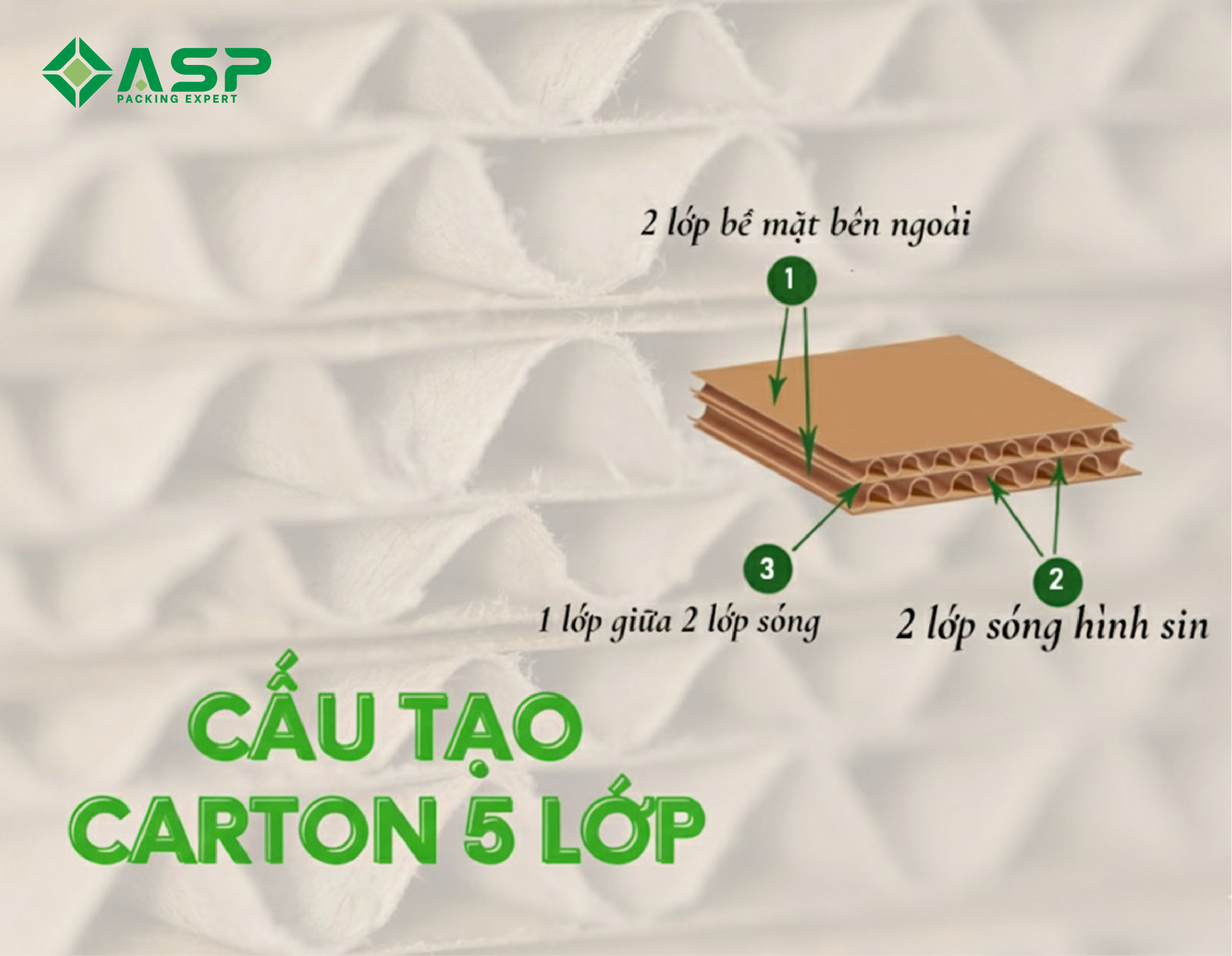 Thùng carton 5 lớp = Lớp mặt + lớp sóng 1 + lớp đệm 1 + lớp sóng 2 + lớp đáy